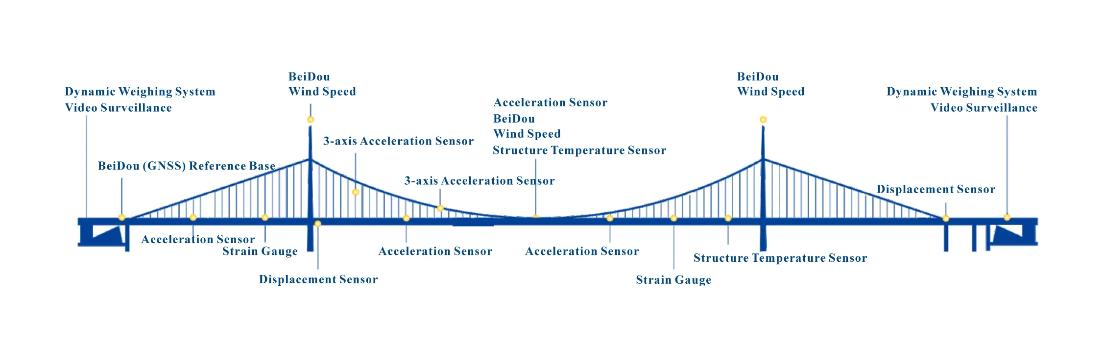 Prin desfășurarea diverșilor senzori, dispozitive de achiziție de date și echipamente de transmisie pe structurile podului, măsurarea automată pe termen lung este efectuată asupra efectelor de sarcină ale podului, efectele asupra mediului și răspunsurile structurale. Datele măsurate sunt transmise platformei cloud prin tehnologii de comunicații cu fir sau fără fir, oferind clienților servicii precum monitorizarea de la distanță a structurii podurilor, avertizare timpurie online, evaluarea stării și suport decizional.