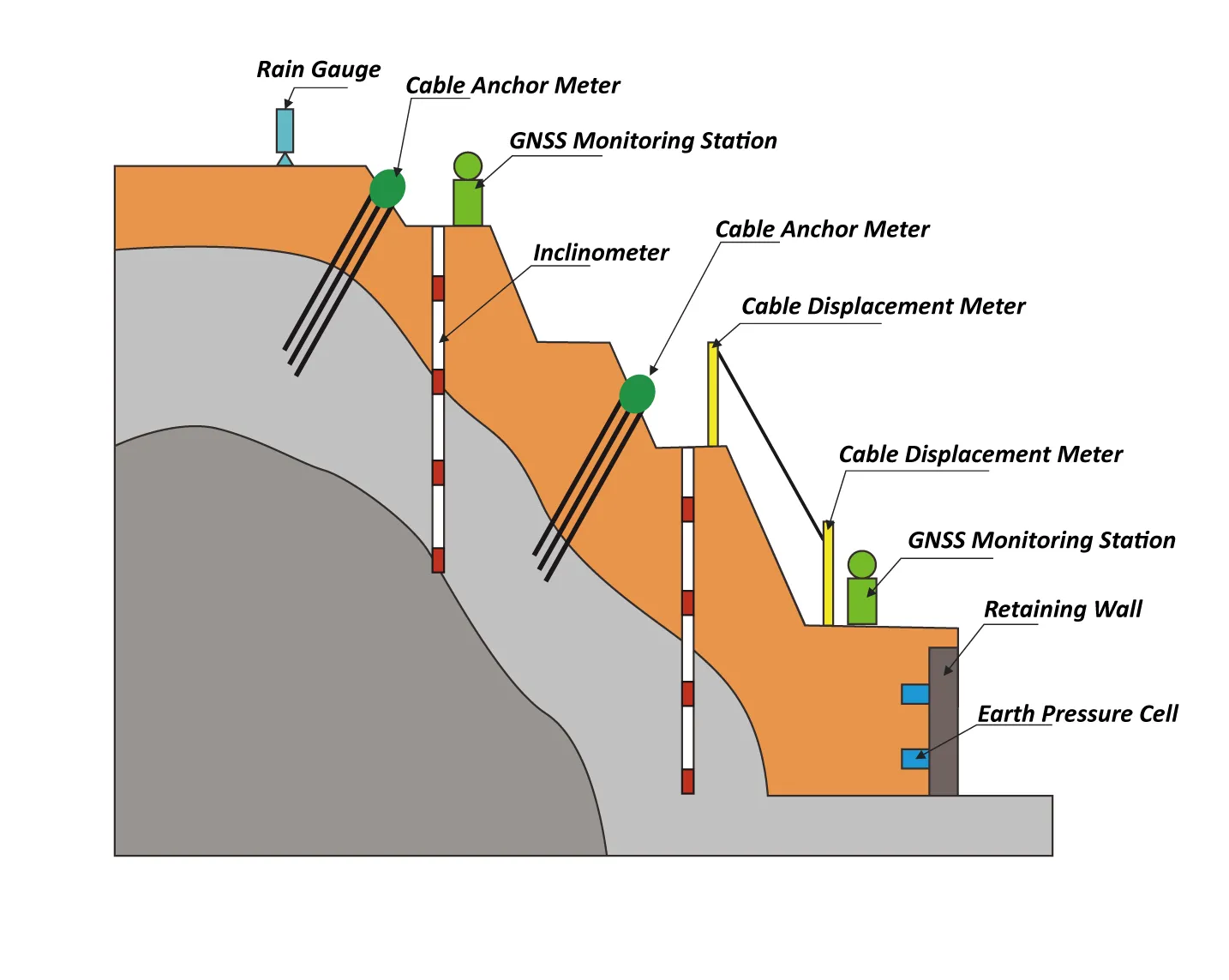 Monitorizarea deplasării adânci, deplasarea suprafeței, monitorizarea cablului de ancorare, monitorizarea precipitațiilor, monitorizarea nivelului apei subterane, alarmă sonoră și vizuală etc.