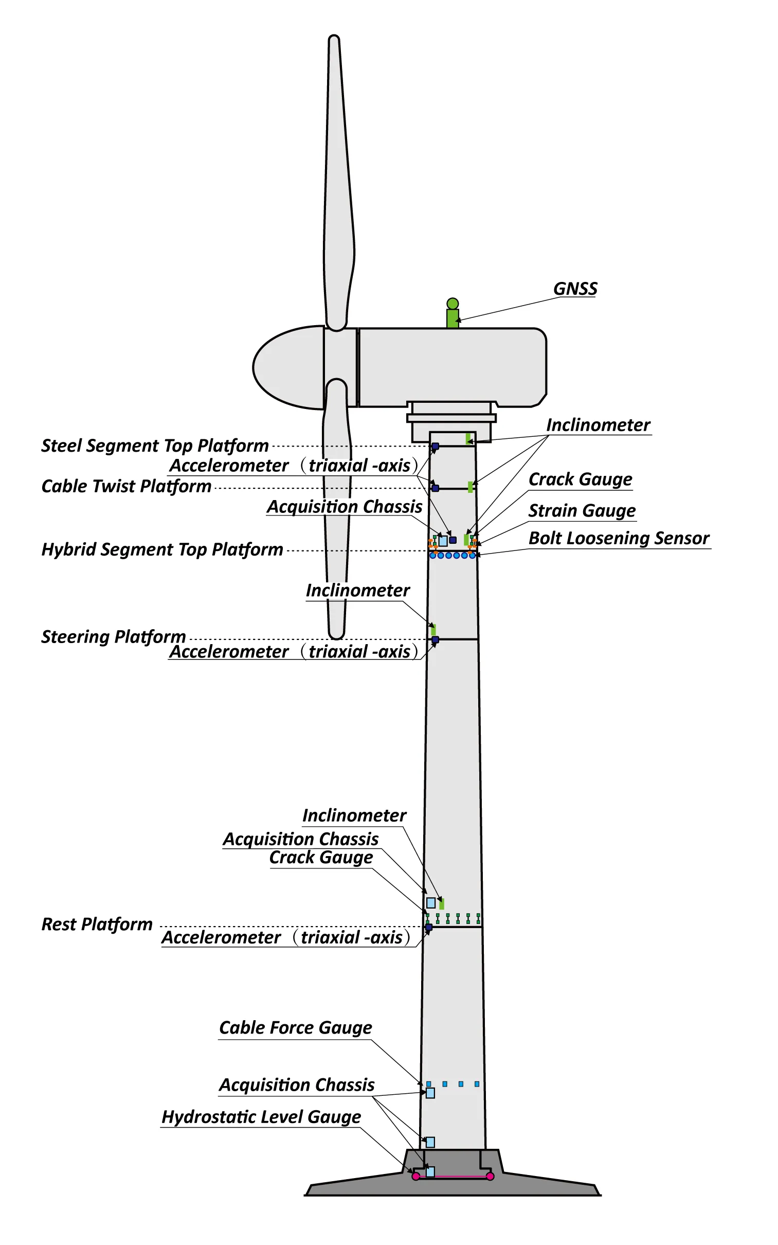 Prin instalarea de senzori relevanți pe turnurile turbinelor eoliene pentru monitorizarea stării, conținutul principal de monitorizare pentru componentele structurale ale turnului turbinei eoliene ar trebui să includă: monitorizarea vibrațiilor turnului, monitorizarea înclinării turnului, monitorizarea tensiunii în secțiunea superioară de tranziție, monitorizarea fisurilor corpului turnului, monitorizarea deplasării turnului, monitorizarea asezării fundației turnului, monitorizarea forței cablului etc., pentru a atinge scopul funcționării în siguranță a turbinei.